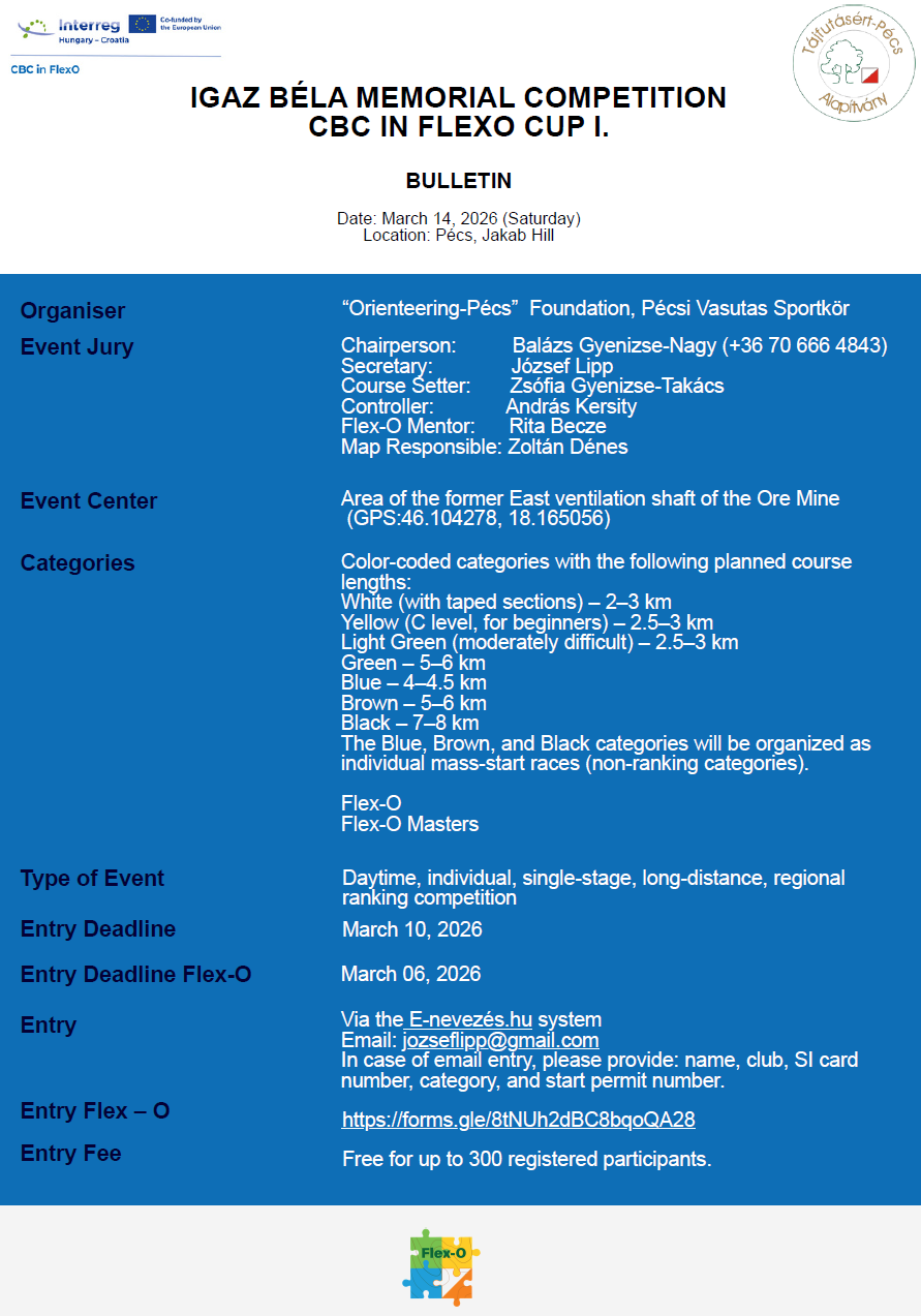 Join our CBC in FlexO project on the first in their series of cross-border orienteering races planned within the project. The race will take place on 14 March 2026 at Jakab Hill, in Pécs, Hungary starting at 10:00.