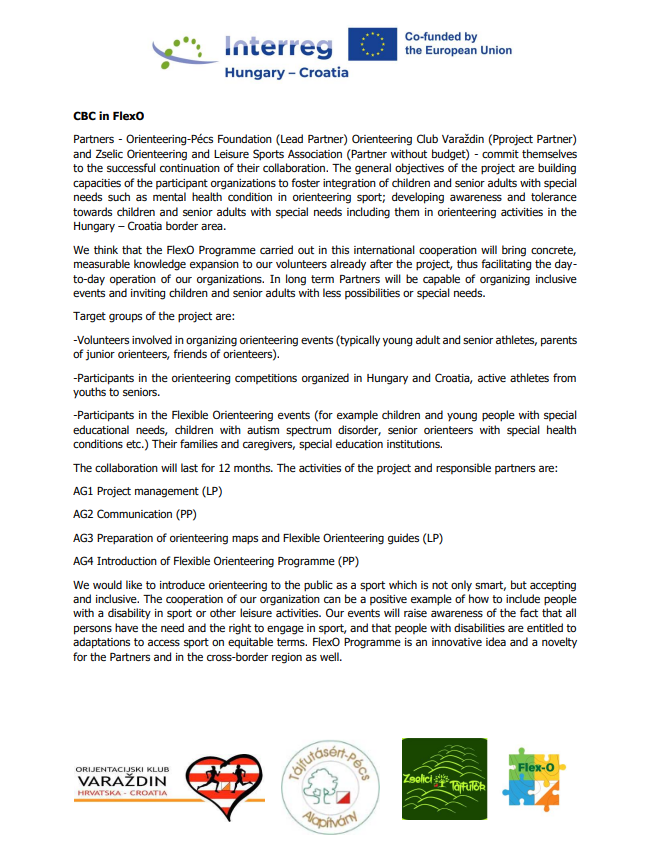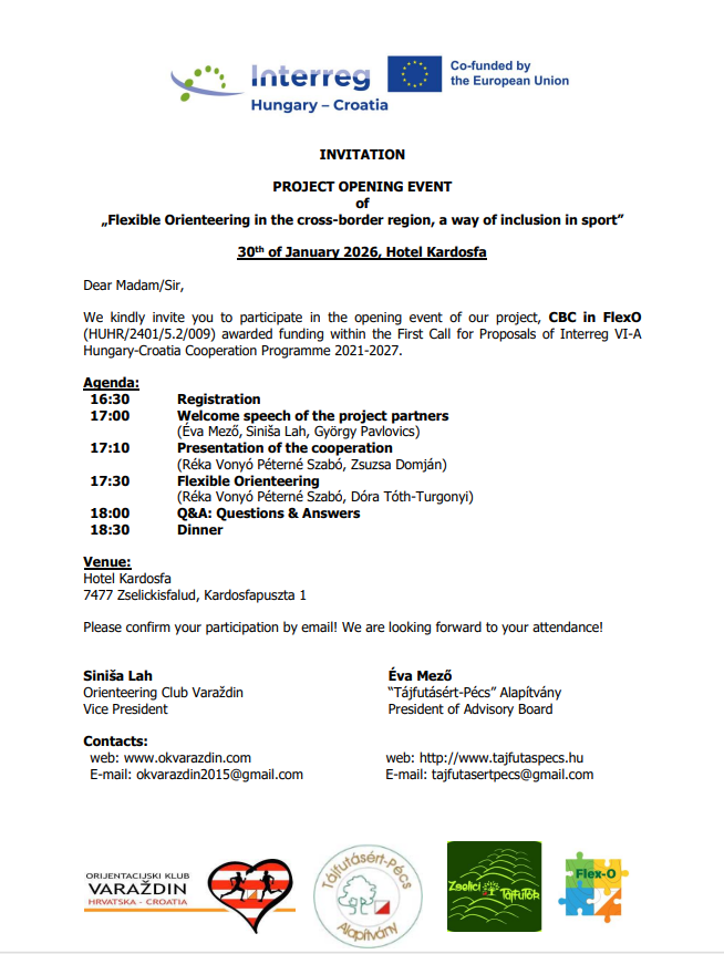 The opening event of the CBC in FlexO project will be held in Kardosfa, Hungary 30 January 2026. The project builds on previous successful cooperation of the partner organisations, two orienteering clubs, and focuses on developing awareness and tolerance towards and the fostering of integration of children and senior adults with special needs in the orienteering sport by including them in orienteering activities in the Hungary – Croatia border area.